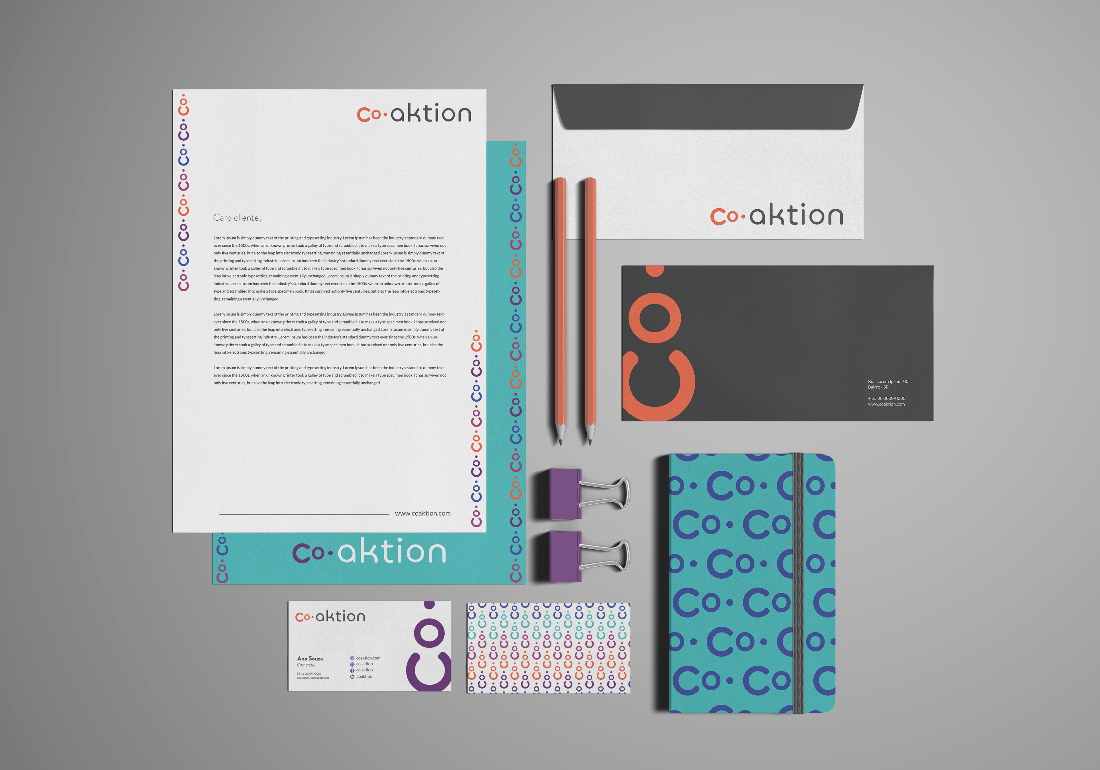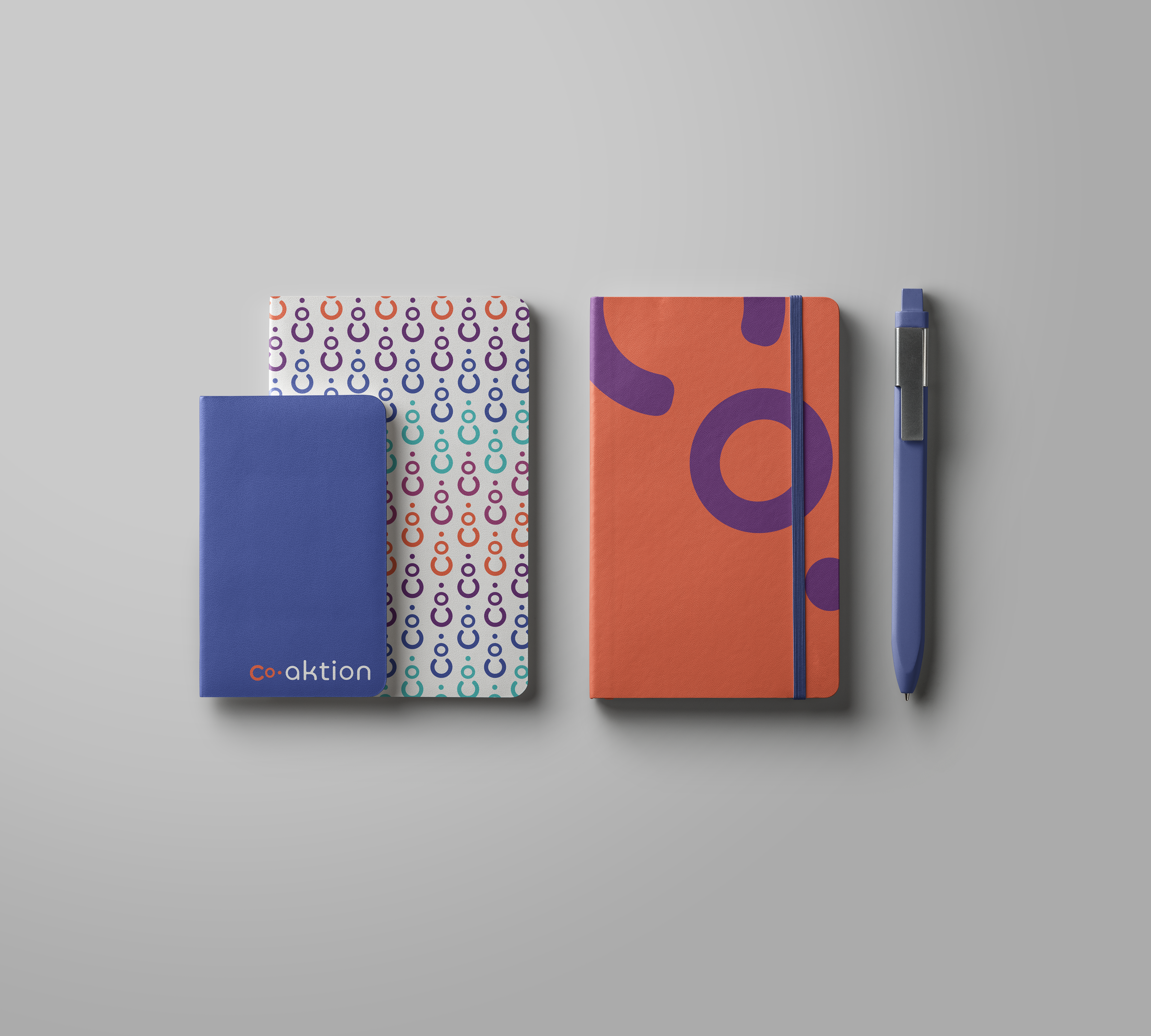 Identidade visual criada para a Co.Aktion, marca mãe do grupos de marcas: Aktie Now, Droz, Callwe e 2listen.